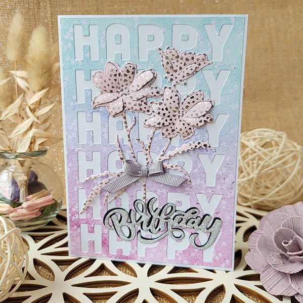 Cette carte entièrement faite main associe un fond pastel vert et mauve, orné du mot HAPPY répété, et d’un bouquet de fleurs découpées avec soin. Pour sublimer l’ensemble : un joli nœud et un “Birthday” scintillant en paillettes qui apporte la touche festive parfaite.