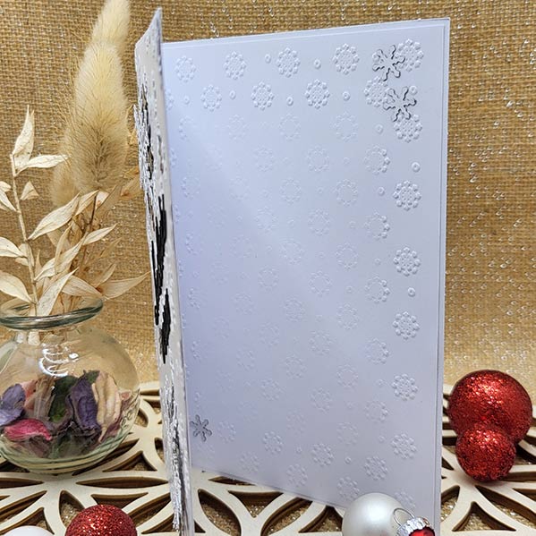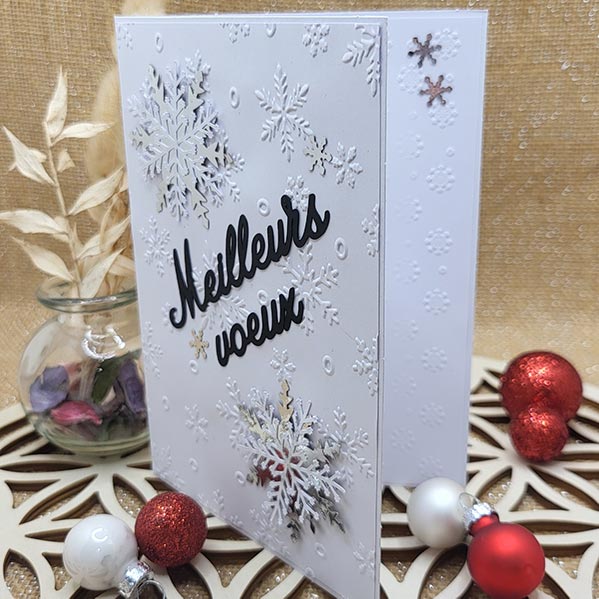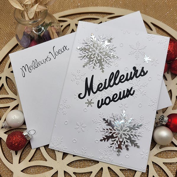 Les flocons en relief attrapent la lumière, le message Meilleurs vœux se détache avec élégance, et chaque détail est pensé pour créer un petit “wahou” à l’ouverture de l’enveloppe ❄️